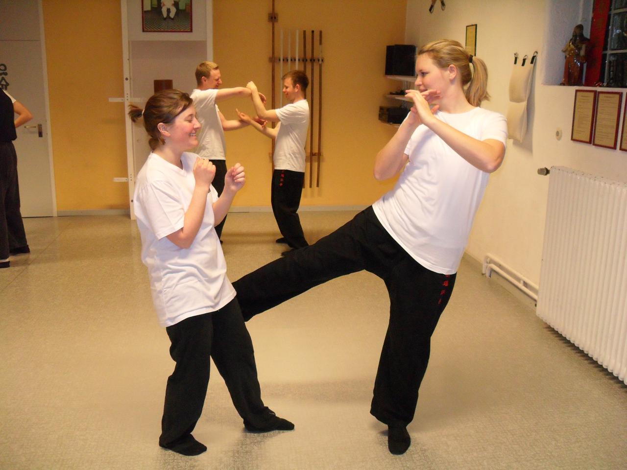 Die Übung hat das Ziel einen Kick mit einem Vorwärtsschritt und den Armen zu parieren.